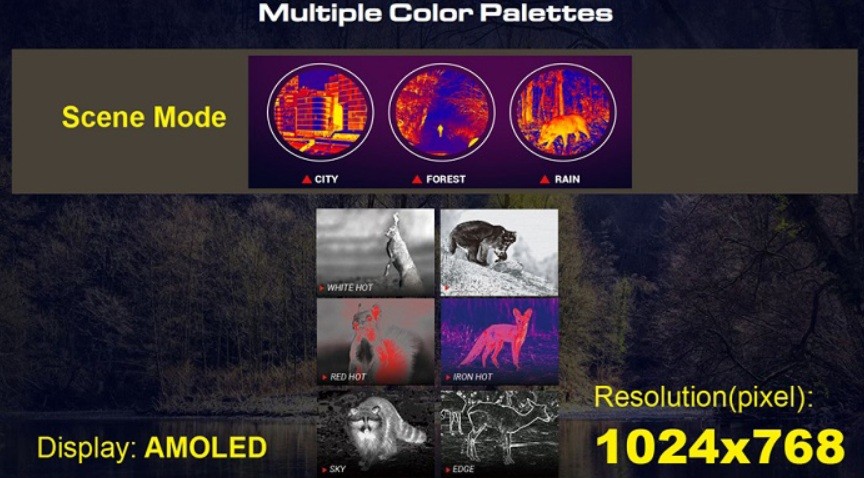 - 6 цветных палитр теплового изображения (White Hot, Black Hot, Red Hot, Iron Hot, Edge, Sky)