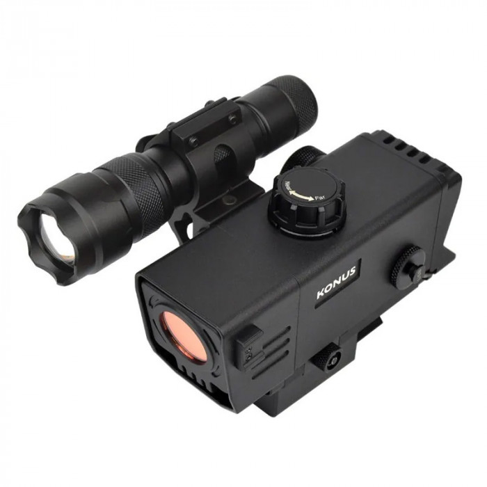 Приціл KONUS KONUSPRO NV-3 3-9×32 має надкомпактний корпус довжиною близько 150 мм і вагою близько 275 г — що дуже мало для пристрою ночного бачення. Корпус оснащений базою швидкого кріплення (Quick Release) на рейку Weaver або Picatinny, що дозволяє встановлювати та знімати приціл швидко і без інструментів. Об’єктив діаметром 32 мм забезпечує достатнє світлозбирання для нічного бачення, а в комплект входить знімний ІЧ-освітлювач, що дає змогу працювати навіть в умовах повної темряви. Крім того, передбачено фільтр денного освітлення, завдяки якому приціл може використовуватись за високої освітленості без ризику засвічення матриці.