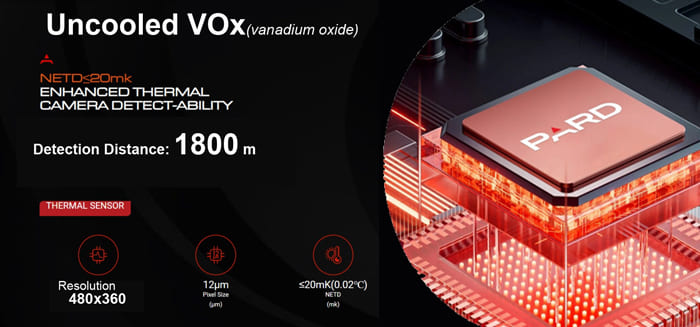 В основі тепловізійного прицілу Pard Pantera 480-35 лежить високочутлива VOx-матриця з роздільною здатністю 480 пікселів, яка формує чітке, деталізоване та контрастне тепловізійне зображення. Сенсор працює у довгохвильовому інфрачервоному діапазоні (LWIR), що є оптимальним для військових і тактичних приладів спостереження.